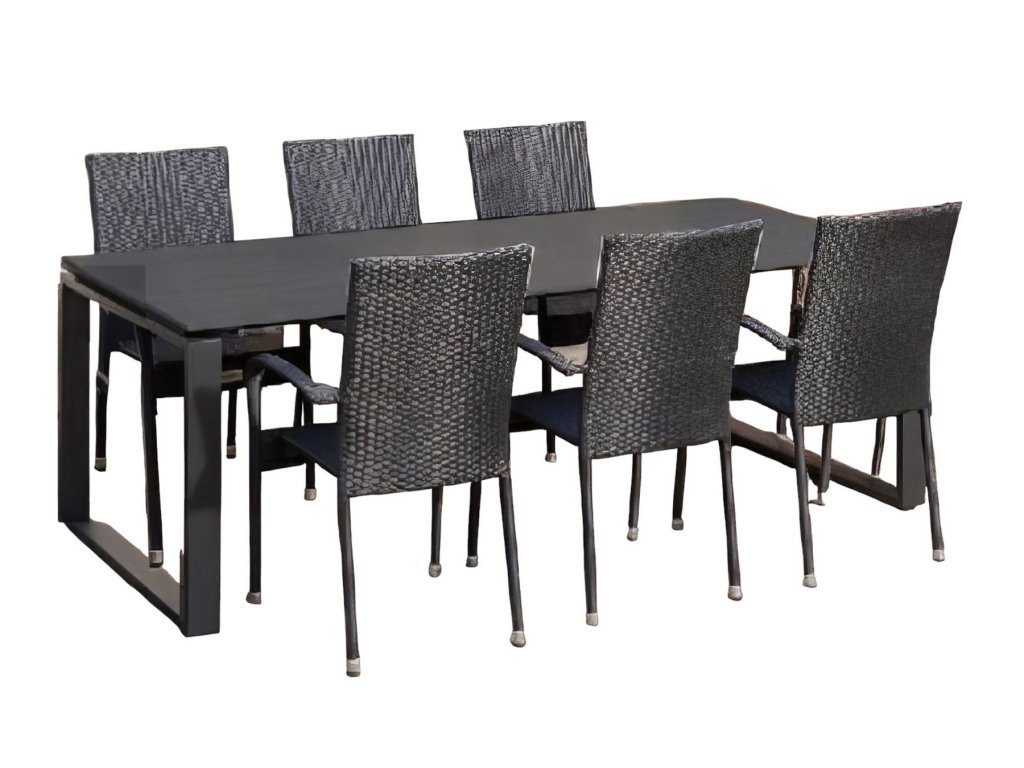 Zahradní sestava (stůl + 6 židlí) - stůl s odolnou Artwoodovou deskou a hliníkovou konstrukcí (š/ v/h): 210 X 74 X 100 cm. Židle -r ozměry (v/š/h): 94 x 56 x 64 cm. Výška sedu 43 cm, šířka sedu 46 cm. Díky použitým materiálům není údržba nejen stolu nijak náročná, stůl je lehký a tím pádem se snadno přenáší. Barevné provedení - černá.