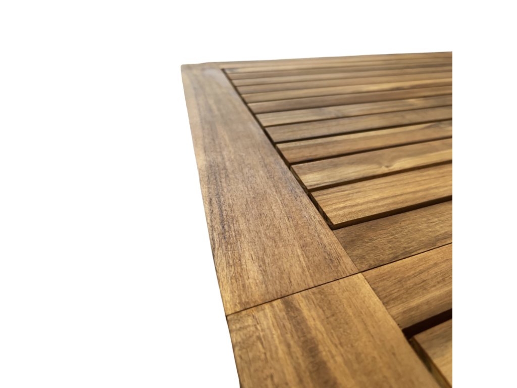 Stůl PANAMA je vyroben z olejovaného akáciového dřeva, které je přirozeně odolné vůči vlhkosti a povětrnosti, vhodné pro venkovní použití.