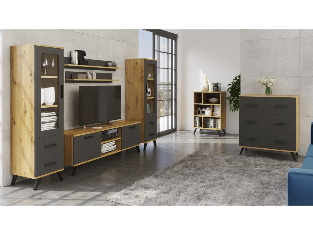 Vyrobena z lamina v dekoru grafit a dub artisan, police kombinuje moderní vzhled s odolností. Lamino je snadno udržovatelné a zakončené ABS lištou pro dlouhou životnost.