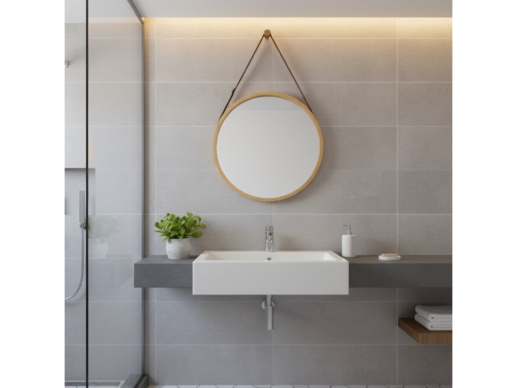 Zrcadlo je vybaveno úchytkou z hnědé ekokůže a dodává se s dřevěným háčkem pro rychlé zavěšení. Povrch rámu je lakovaný, což usnadňuje čištění a zajišťuje dlouhou životnost.