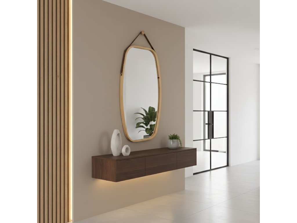 Zrcadlo je vybaveno úchytkou z hnědé ekokůže a dodává se s dřevěným háčkem pro rychlé a bezpečné zavěšení na zeď.